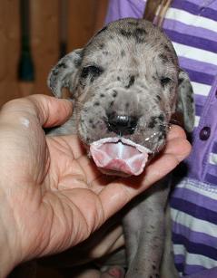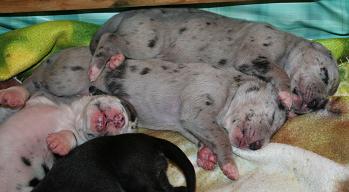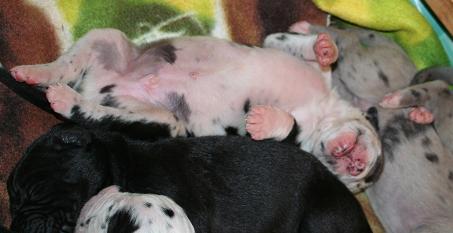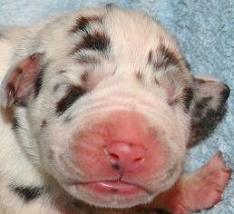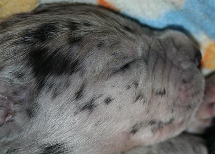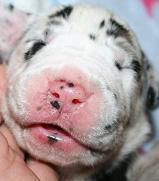 Info zur Nasenverfärbung der gefleckten und grauen Welpen durch kleine schwarze Pigmentflecke, (die ganz kleinen sieht man fast garnicht bei der Geburt) auf der Nase und auch auf der Ober-Unterlippe, färbt sich die Nasen und die Lippen der gefleckten und grauen Welpen nun von Tag zu Tag immer dunkler, bis sie später je nach Pigmentierung kpl. schwarz wird. |