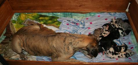 ... er (Nr.10) hat seine Augen schon weiter geöffnet und seine Nase ist schon wieder etwas dunkler geworden Spannend wird es in den nächsten Tagen/Wochen noch werden, ob die gefleckten Welpen dunkle Augen bekommen, oder ob welche dabei sein werden, die eventuell blaue Augen bekommen, was bei den Gefleckten vorkommen kann. Bei der Geburt bzw. beim öffnen der Augen, haben jedoch anfangs alle Welpen einen leichten Blauschimmer, dieser wird sich in den nächsten Wochen umfärben. |