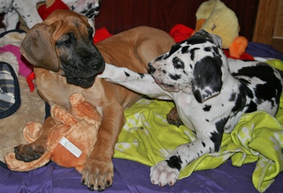 den nächsten Tagen nach und nach ausziehen werden. In der Rubrik Unsere Nachzuchten hat jeder Welpe eine eigene Seite, dort werden wir im Zukunft die Bilder und Infos, die uns die Welpeneltern zur Verfügung stellen, online stellen. Bis auf Quincy und Quax haben inzwischen alle Welpen ihre passenden Familien gefunden. Wir wünschen allen Besitzern viel Spaß, viel Freude und ganz ganz viele schöne Doggenjahre. Über Quax und Quincy werden wir weiterhin in Neuigkeiten berichten und hoffen, das auch die zwei bald ein schönes, neues Zuhause finden werden. |
