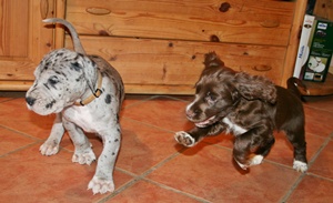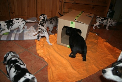 Auszug ins Welpenhaus Das Wurfkistenalter ist inzwischen vorbei, daher heißt es heute Umzug ins Welpenzimmer. Tagsüber sind unsere Welpen auch weiterhin bei uns im Haus, Nachts schlafen sie jedoch nun zusammen mit Mama Iljana und unseren Q-Welpen im großen Welpenhaus. Nun können die Kleinen auch selbständig nach Lust und Laune den ganzen Tag nach draußen und im Garten spielen und toben. Und wenn es regnet, oder einfach zu kalt ist, können alle Welpen auch im Welpenzimmer spielen. Dort ist es auch schön Warm mit Fußbodenheizung und Heizstrahler und vor allem haben sie nun viel Platz, um zu toben, bellen :-), spielen und wir müssen keine Bedenken haben, das sie Unsinn machen. Da die Kleine Rasselband natürlich noch nicht stubenrein ist und sie es auch Nachts trocken und vor allem rutschfest haben sollen, verteilen wir Späne auf den Fliesen, das ist super praktisch diese saugen die kleinen Pfützen auf, so laufen die Kleinen nicht durch ihre eigenen Pfützen beim spielen und rutschen dann aus. Denn auch Nachts wir eifrig gespielt und getobt :-) am morgen können wir dann die Späne einfach austauschen.