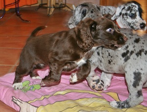 13.12.13 Tag 37 Heute hat sich die Kleine 9.Wo. alte Working Cocker Hündin Josie mit unter die Welpen gemischt. Eher gesagt hat sie die Kleinen aufgemischt, denn die Kleine Josie hat richtig Pfeffer im Hintern ein Jagdhund halt :-). |