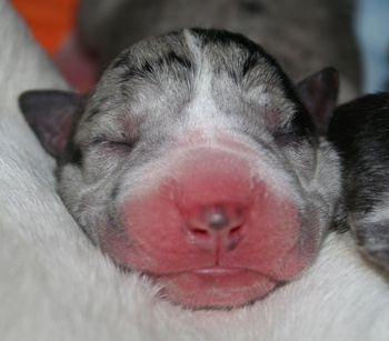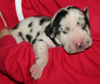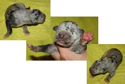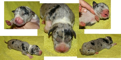 Hündin grau-gefleckt Nr. 9 Abzeichen: weißer Brustfleck bis zum Bauchnabel, vorne recht schwarzes Bein, alle 4 Pfoten weiße Abzeichen