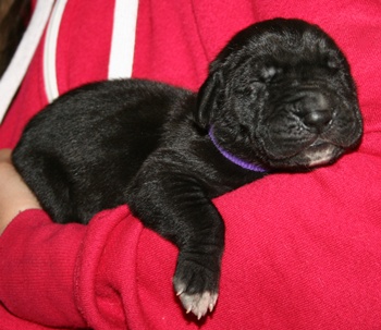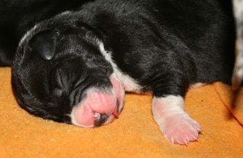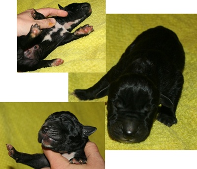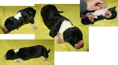 Hündin schwarz Nr. 7 Abzeichen: Riesen großer weißer Brustfleck bis unter dem Hals, kleiner weißer Nasenrücken, weißer (T-) Strich im Nacken, alle 4 Pfoten weiße Abzeichen