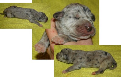 Hündin grau-gefleckt Nr. 8 Abzeichen: weißer Brustfleck bis Mitte Bauch, alle 4 Pfoten weiße Abzeichen |