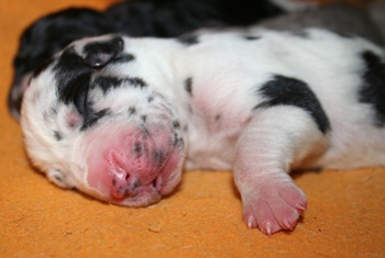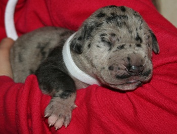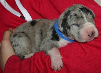 Rüde grau-gefleckt Nr. 2 Abzeichen: weißer Halskragen, Riesen großer weißer Brustfleck, weißes Maul u. weißer Nasenrücken, weißer Stirnstrich, alle 4 Pfoten weiße Abzeichen -vorne weiße Stiefelchen, weiße Rutenspitze |