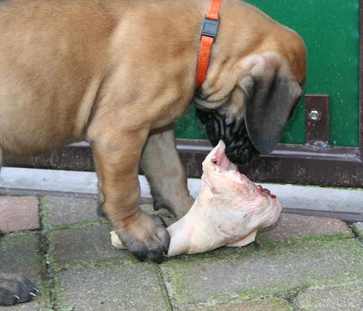 Neben dem Welpentrockenfutter, werden unsere Welpen ab der 5. Woche auch B.A.R.F gefüttert (Biologisch Artgerechte Roh Fütterung) Hier mehr zum Thema ausgewogene Ernährung mit Frischfleisch: www.barfers.de/barf/index.htm Heute gab es etwas ganz besonderes : ROHE Hähnchenschenkel, den Kleinen hat es sehr viel Spaß gemacht daran zuzerren / Stücke abzureißen und geschmeckt hat es allen auch sehr gut. |