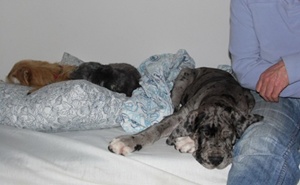 26.12.12 Ophelia ist gut angekommen Ophelia ist im neuen Zuhause nach 4 Stunden Autofahrt gut angekommen. Damit Phienchen nach der ersten Erkundung der neuen Umgebung im Zuhause etwas zu Ruhe kommt, hat sich ihr Herrchen gleich mit ins Hundebett gelegt :-)))) Also alles im Lot ....fressen klappt, pieschen waren wir auch schon und schlafen geht auch ;-) ![]() |