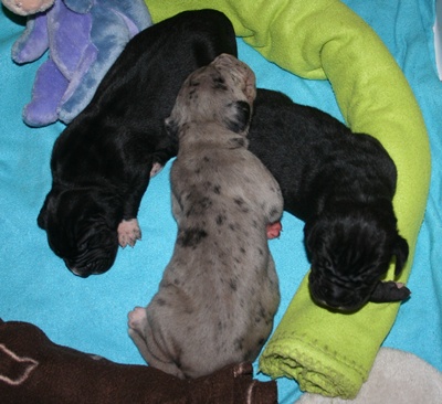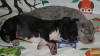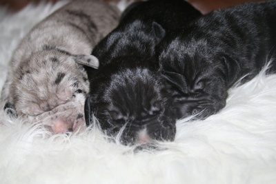 14.06.14 Heute sind unsere 5 Welpen geboren zwei Schwarze Rüden und eine Grautiger Hündin. Leider lag ein Grautiger Rüde quer im Geburtskanal und hat daher auch den Weg für seine Gefleckte Schwester versperrt, die Beiden Süßen haben es leider nicht geschafft . Mama und den drei Kleinen geht es gut und wir freuen uns auf eine wunderschöne Welpenzeit. |