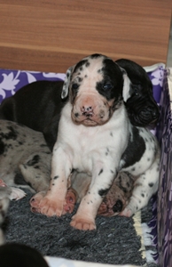 Tag 18 Ab heute werden wir anfangen, kleine Mahlzeiten dazu zufüttern. Zu Anfang gibt es, leckere Welpenmilch, in ein paar Tagen dann Welpenbrei. Wie man sieht hat es allen sehr gut geschmeckt. Nur an den Tischmanieren muss noch etwas gearbeitet werden :-) ... Ein kleines Video von der ersten Fütterung gibt es auch bei uns auf der Facebookseite zu sehen: AndreaNee DeutscheDoggen Vom Nordstern bei Facebook (klick hier)