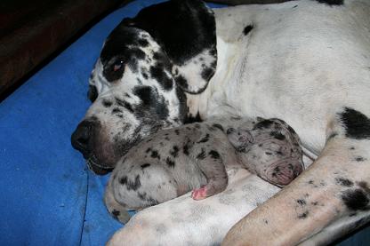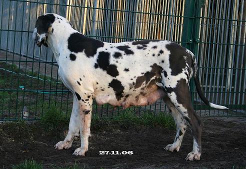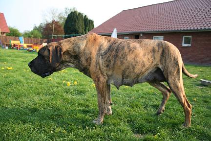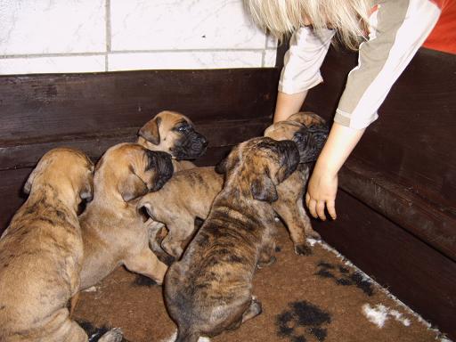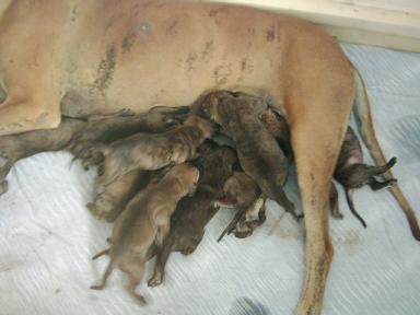 großen Würfen Unmengen an Milch produzieren. Damit ihre Kondition nicht unnötig unter den Kindern leidet, achten wir darauf sie nun besonders hochwertig und sorgfältig zu ernähren. Welpenmilch, sowie Calciumpräparate, Aufbaukonzentrate aus der Apotheke und hochwertiges Fleisch als Zusatz zum Leistungsfutter sind für uns hier eine Kombination, mit der wir immer gut gefahren sind. |